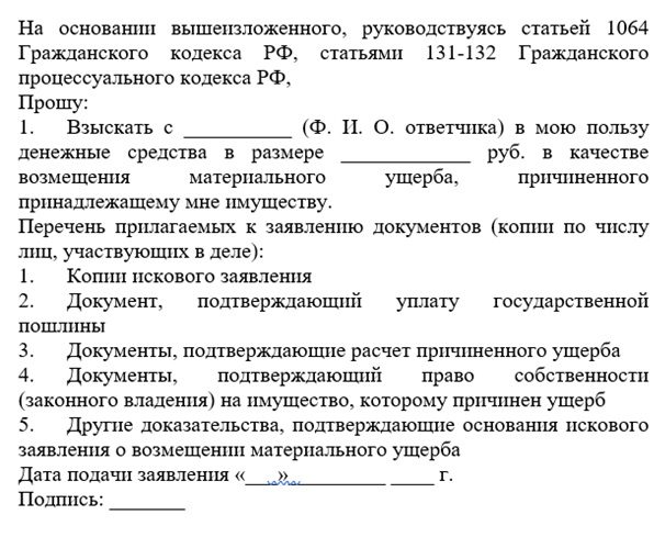 Образец искового заявления о возмещении материального ущерба